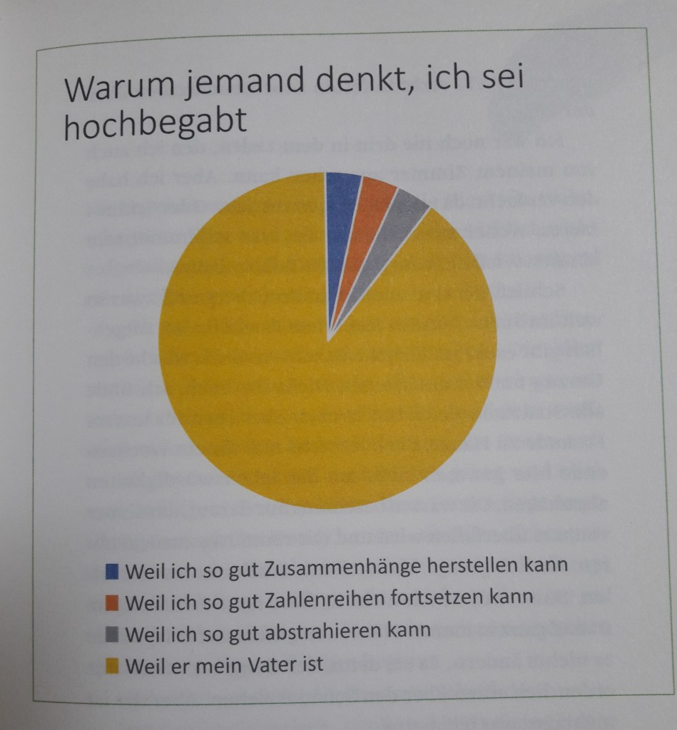 „Die App besteht aus mehreren Spielen; man muss sich zum Beispiel den kürzesten Weg durch ein Labyrinth merken oder Wörter vervollständigen. Eigentlich gar nicht mal so übel – abgesehen von diesem Warnton. Der setzt superlaut ein, sobald ich mich vertue. Jedes Mal blickt Papa auf. Dann nickt er mir enthusiastisch zu wie ein Coach.“ (S.60)